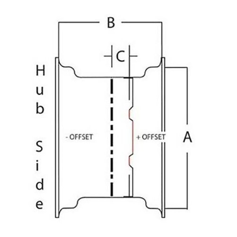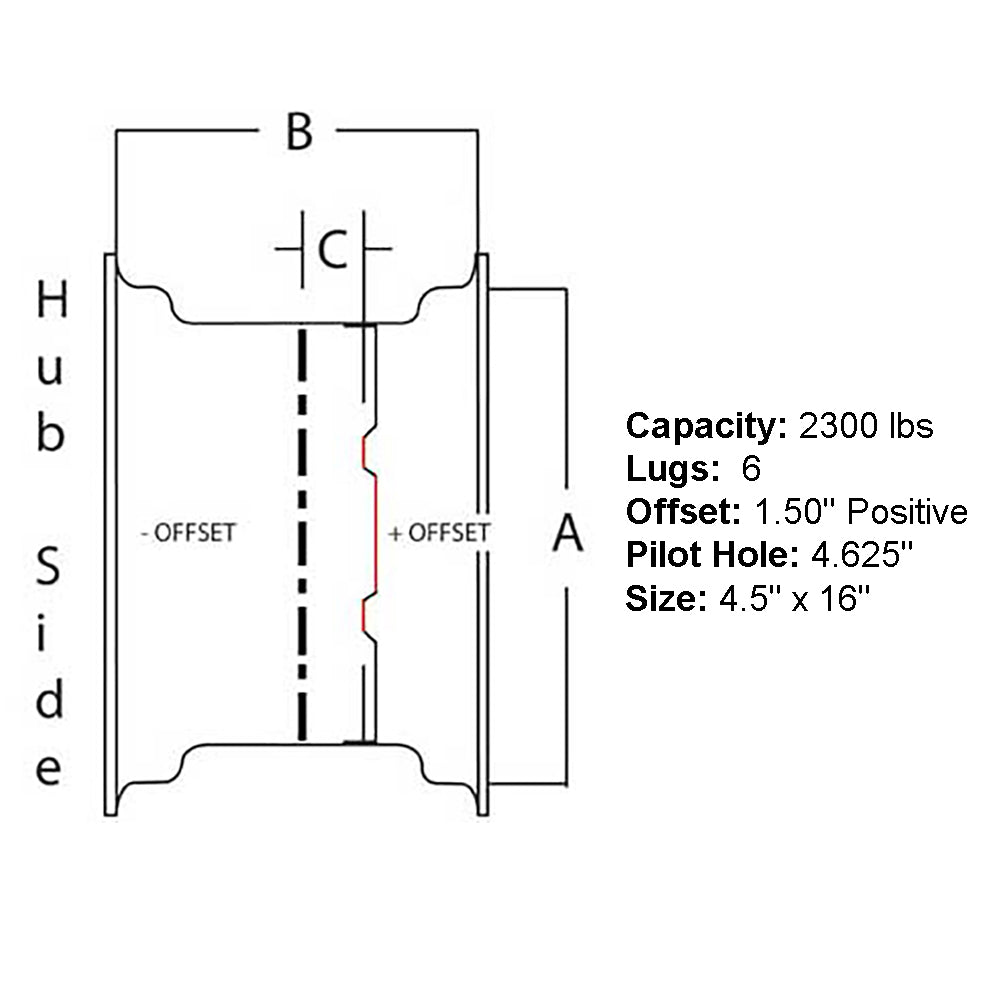 Size: 4.5" x 16" Offset: 1.50" Positive Pilot Hole: 4.625" Lugs: 6 Capacity: 2300 lbs Valve Stem hole: 5/8"Reference Numbers: